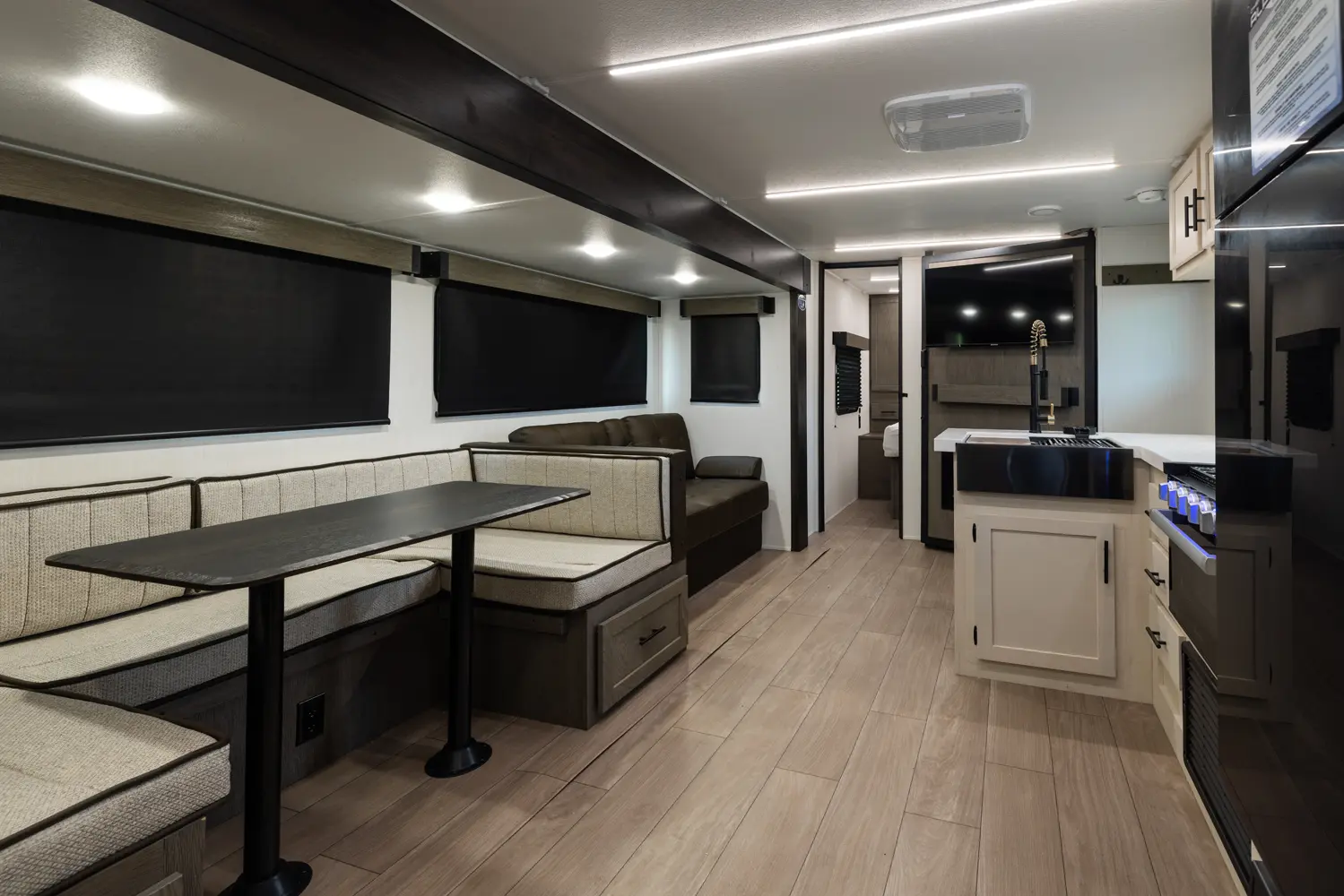 Looking for a lightweight and affordable option for your family? The Alpha Wolf 26DBH by Forest River may be the perfect fit with a smartly designed bunkhouse floorplan. Featured in the rear are double stacked bunk beds and a full bathroom with an entry/exit door. The kitchen is well equipped with a full-size pantry, 12-volt refrigerator, farm style sink, oven and a microwave. The-U-shape dinette and living room sofa both double as extra sleeping when not in use. Up front is a queen size bed.