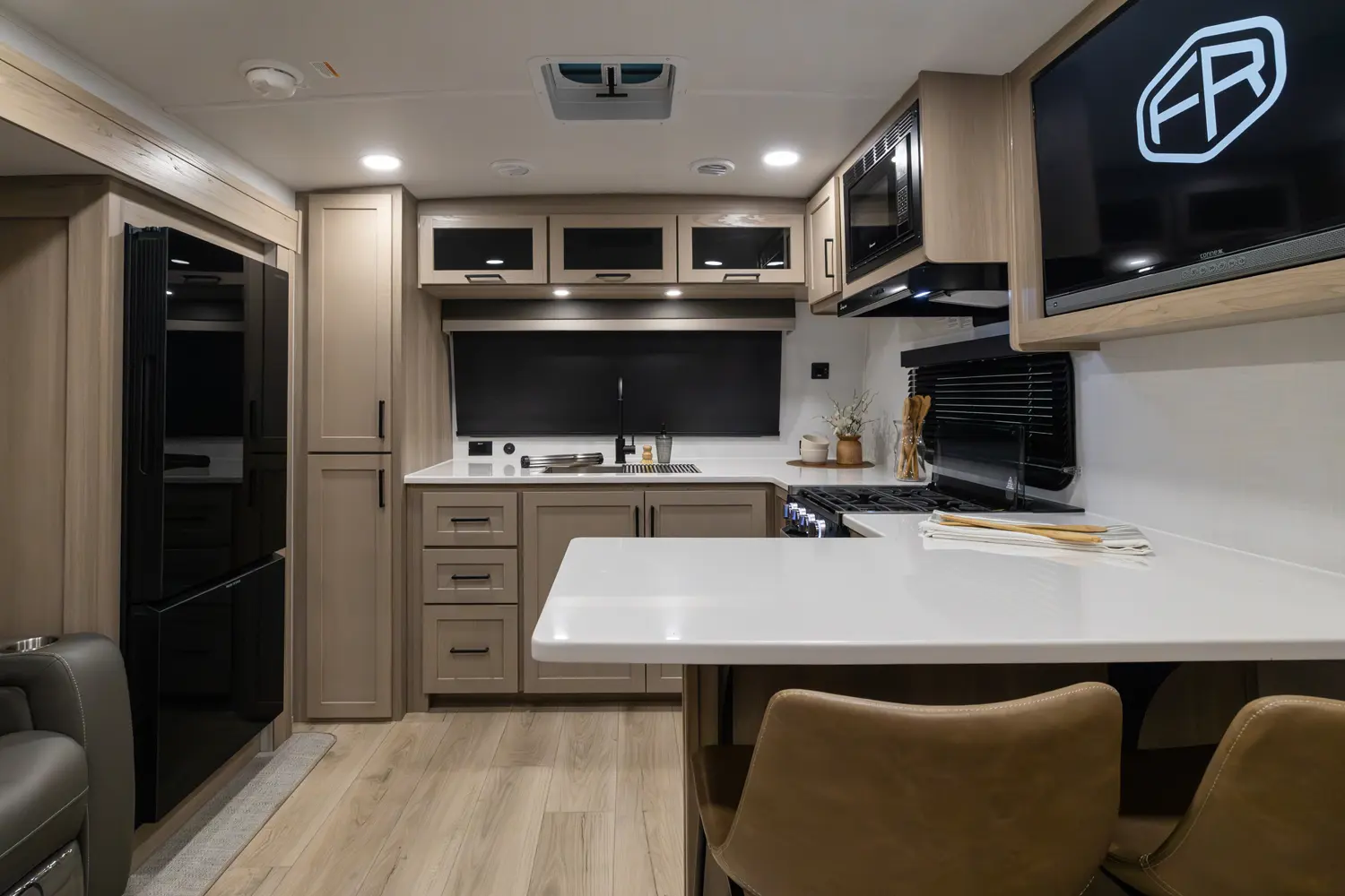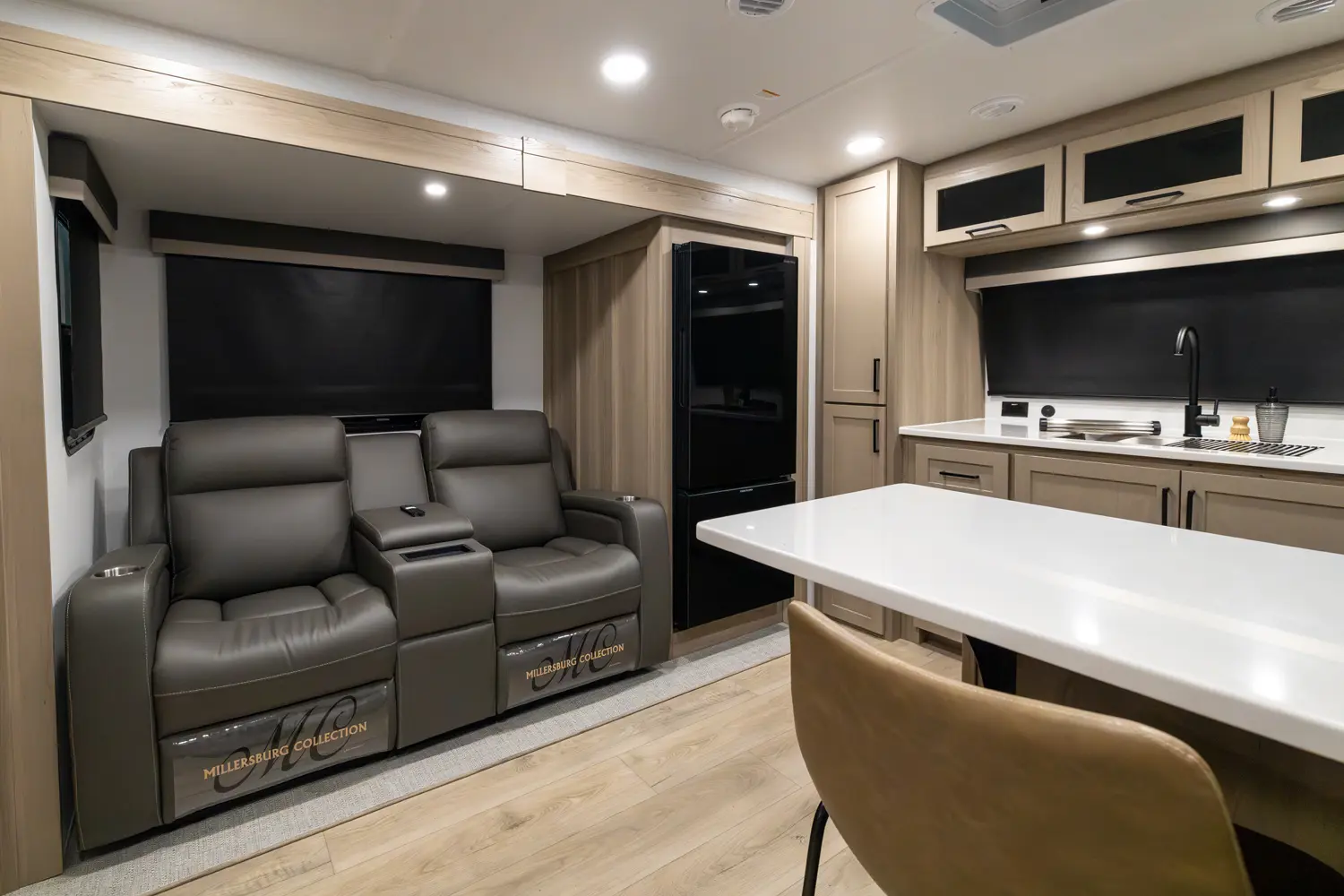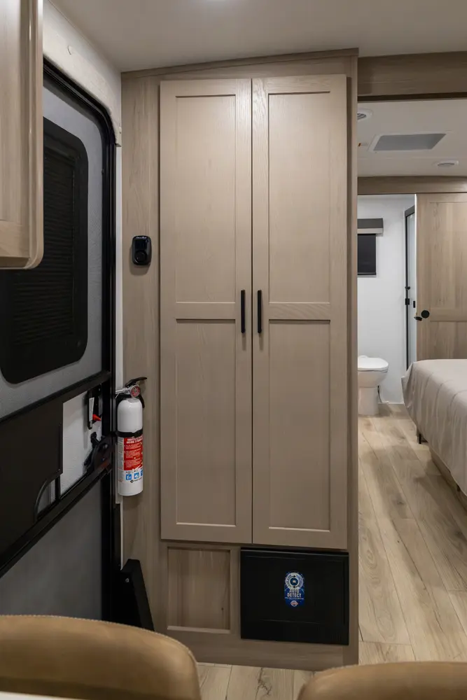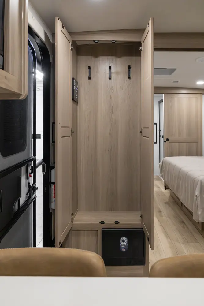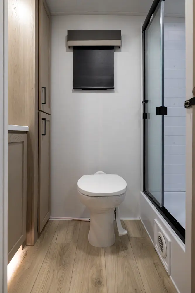 The front kitchen with a large window creates an open, inviting feel with great campsite views. Theater seating faces the entertainment center for easy viewing, with an optional hide-a-bed for guests. The bedroom includes a queen bed in a slide-out, dresser, and wardrobe with washer/dryer prep. A spacious bathroom with a large shower and linen storage adds comfort and convenience, making this coach feel like home.