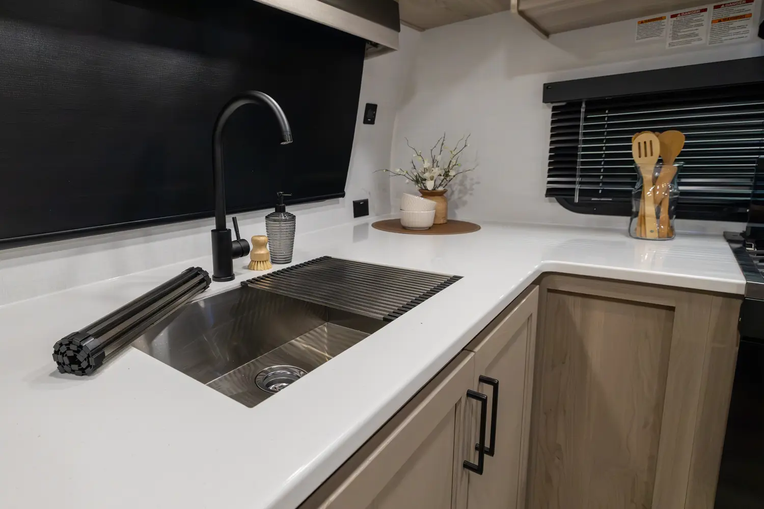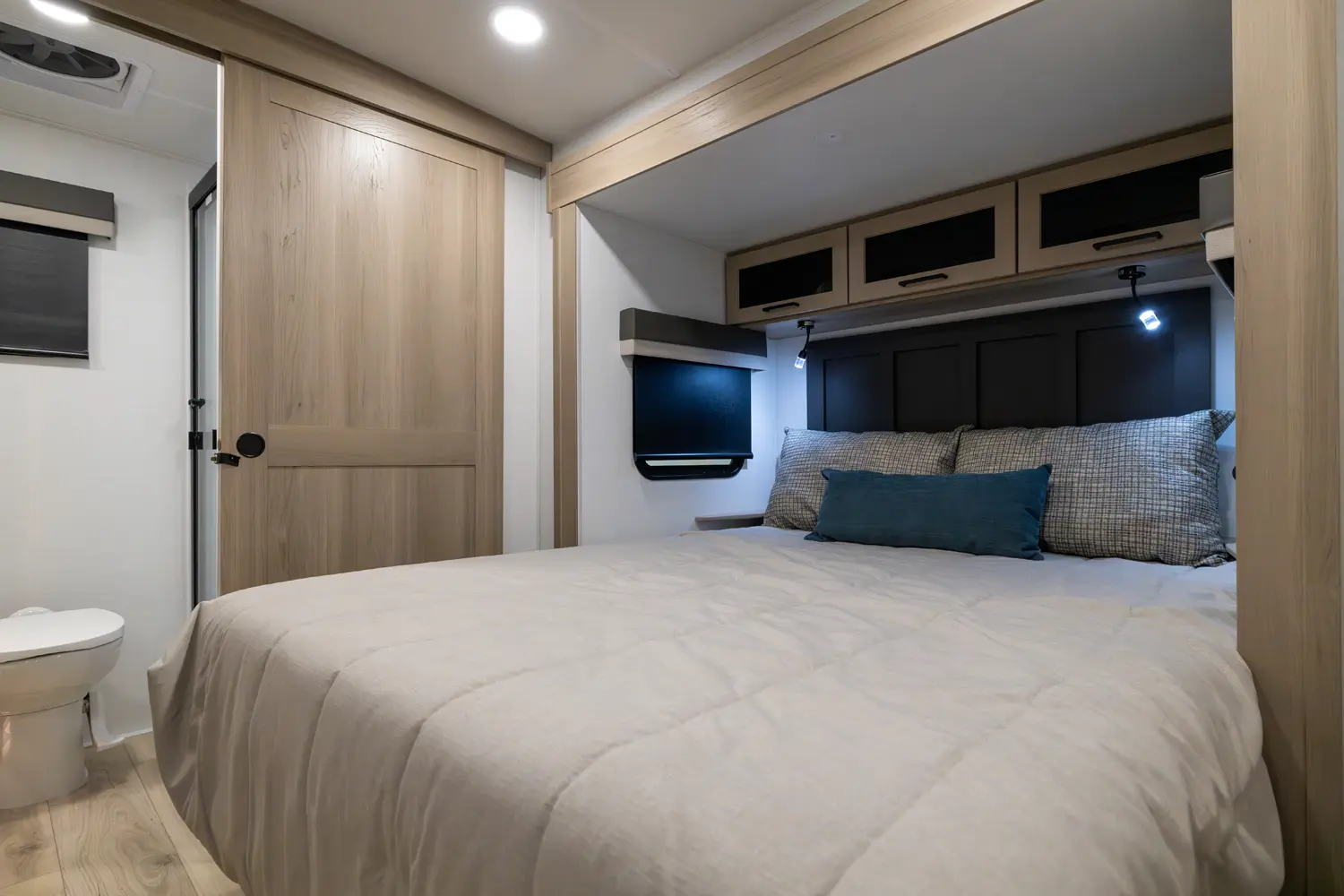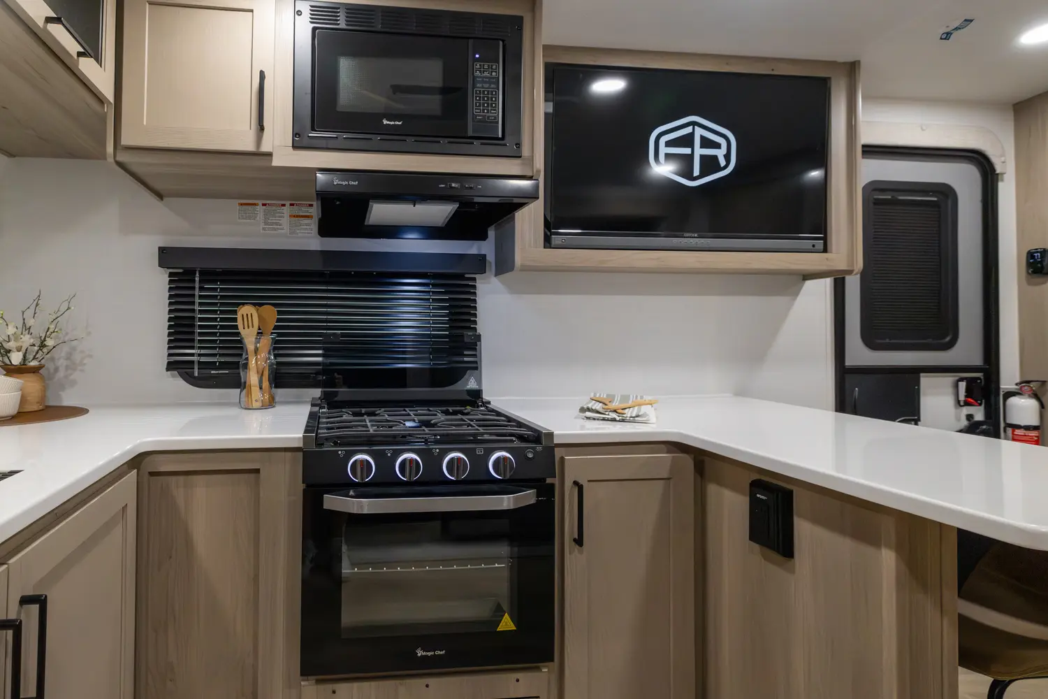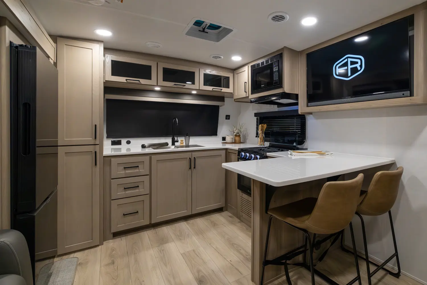The front kitchen with a large window creates an open, inviting feel with great campsite views. Theater seating faces the entertainment center for easy viewing, with an optional hide-a-bed for guests. The bedroom includes a queen bed in a slide-out, dresser, and wardrobe with washer/dryer prep. A spacious bathroom with a large shower and linen storage adds comfort and convenience, making this coach feel like home.