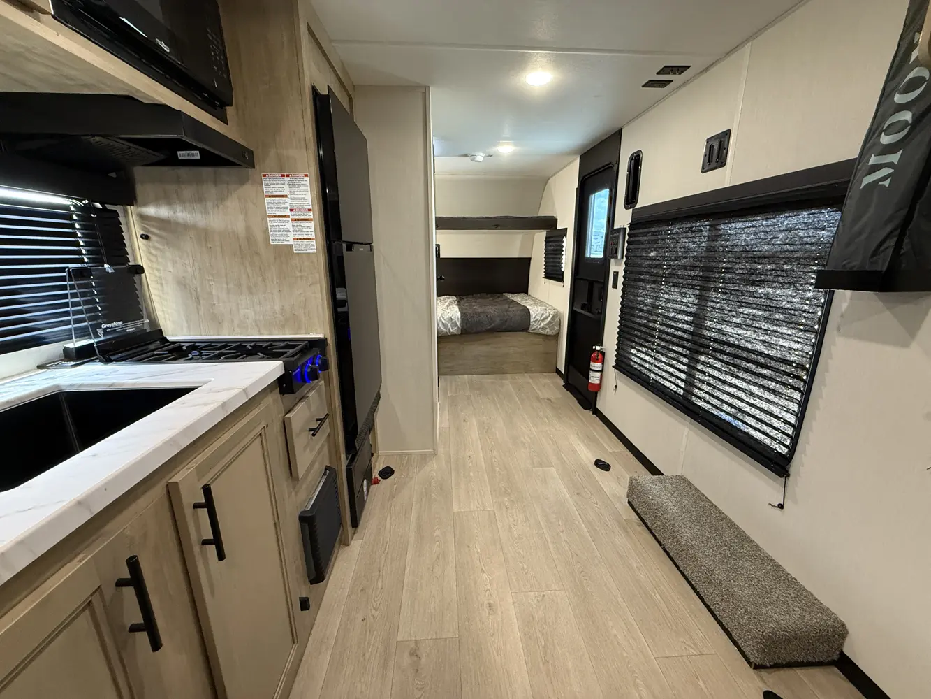 The 18RJBW is what a small toy hauler should be with the right combination of size, weight, and storage capacity for your toys. A modern chef’s kitchen, dinette area, queen size bed with overhead bunk and functional bath highlight the interior of this unit. On the exterior the exclusive Pup patio system will give you a great elevated seating area. As with all Pups, our outside awning area is second to none. Entertain guests with our outside entertainment area with speakers, and TV bracket.